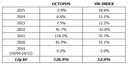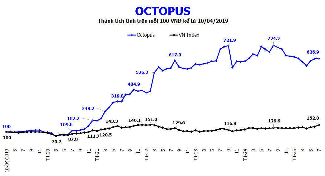 17/08/2025 10:30Tháng 7/2025, Octopus ghi nhận hiệu suất -0.15%, trong khi VN-Index tăng mạnh +9.19%. Khoảng cách ngắn hạn giữa chúng tôi và chỉ số tham chiếu vì thế tiếp tục nới rộng.