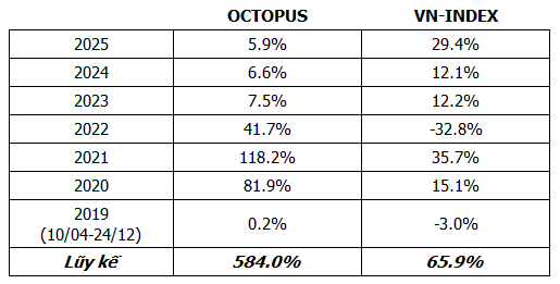 Tháng 10/2025, Octopus có hiệu suất -1.13%, trong khi chỉ số VN-Index -1.33%.