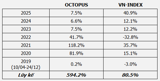 Về dài hạn, Octopus đặt mục tiêu tạo ra mức lãi kép trung bình 26% mỗi năm cho Nhà đầu tư, đồng nghĩa với việc nhân đôi giá trị vốn của Nhà đầu tư sau mỗi giai đoạn ba năm.